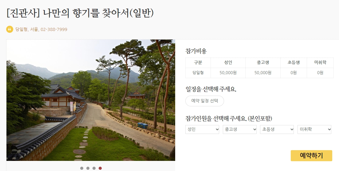 템플스테이 공식 플랫폼에서도 진관사 프로그램을 검색하고 쉽게 예약할 수 있습니다. 참가자 정보 입력 후 결제 완료로 예약이 확정됩니다.